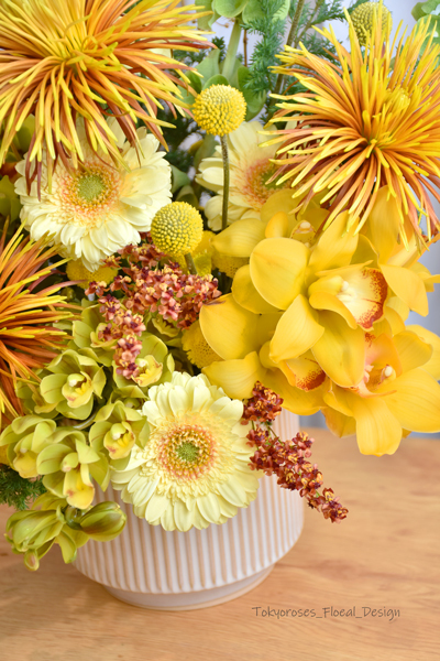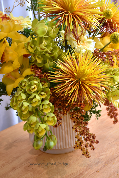 《 使用花材 》貝殼花 ,黃東亞蘭, 煙火菊, 小綠東亞蘭, 餅乾太陽花 ;金杖菊,金胡椒等