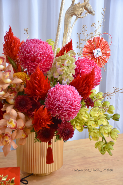 《 使用花材》 貝殼花, 橘小東亞蘭, 牡丹菊, 煙火菊, 鳳尾雞冠, 紅棒棒菊, 金人心木等