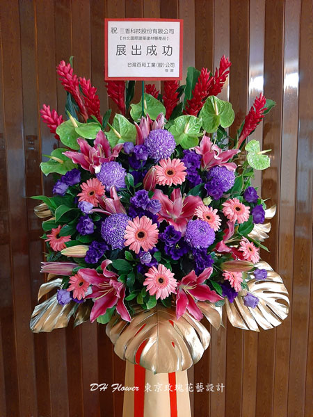 《 使用花材 》主花~紫牡丹菊,紅薑花,紅色百合, 配花~ 綠火鶴,太陽花,桔梗