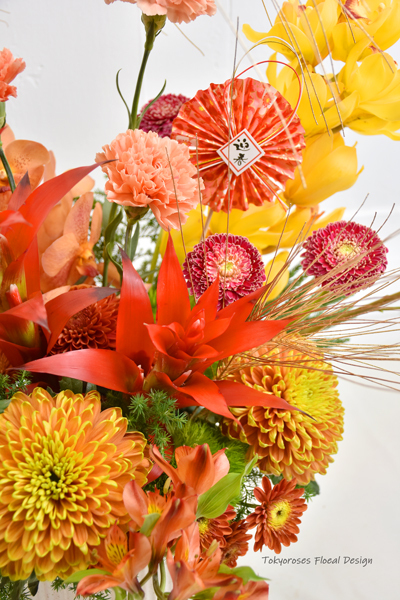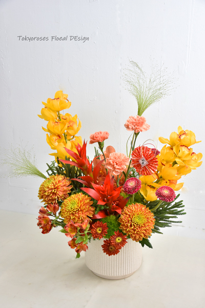 《 使用花材 》 東亞蘭, 鳳梨花 菊花, 餅乾太陽花,巨輪千代蘭, 綠石竹;噴泉草,圓扇等
