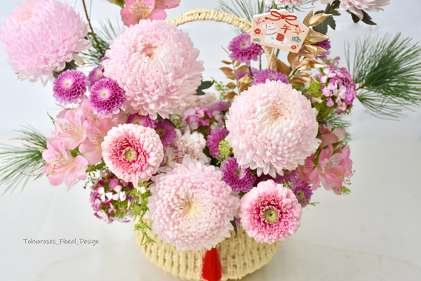 《 使用花材 》粉牡丹菊,太陽花,水仙百合, 撫子花 ; 進口小圓菊等